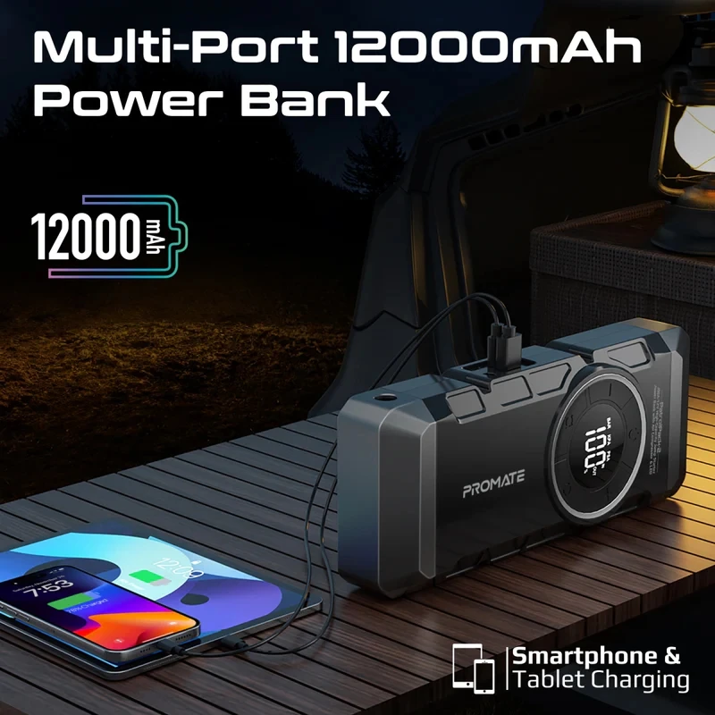 چندمنظوره 4 در :1 جامپ استارتر خودرو، پاوربانک چند پورتی، چراغ قوه LED و کمپرسور هوا در یک دستگاه.