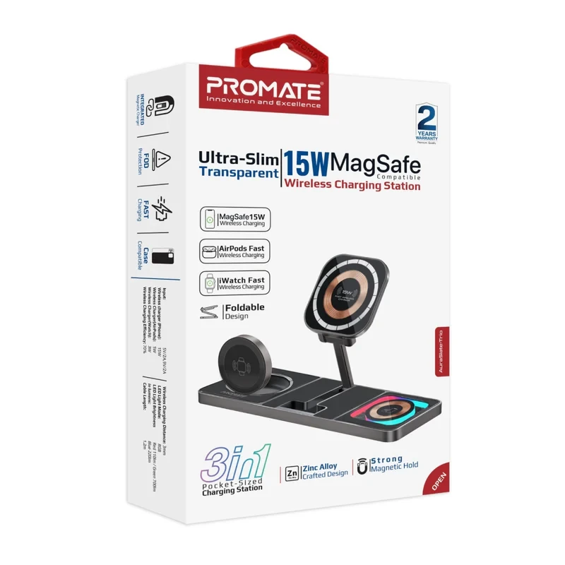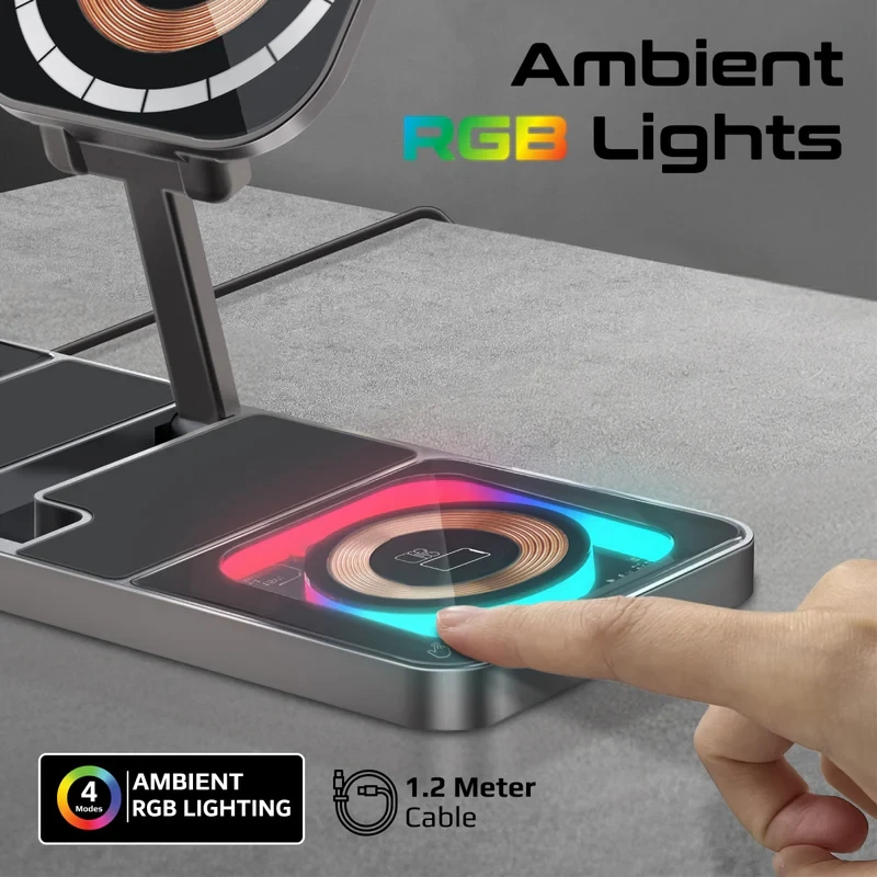 AuraSlate-Trio یک ایستگاه شارژ چندمنظوره 3 در 1 است که به شما امکان میدهد به طور همزمان گوشی، ایرپاد و اپل واچ خود را شارژ کنید. این دستگاه با طراحی شفاف و باریک، قابلیت شارژ سریع بیسیم و ادغام با فناوری MagSafe را ارائه میدهد و نهتنها تجربهی شارژ را بهینه میکند، بلکه با چراغهای RGB داخلی فضایی زیبا و دلپذیر ایجاد میکند. این دستگاه دارای کابل 1.2 متری است که آزادی عمل بیشتری برای قرار دادن ایستگاه شارژ در مکانهای مختلف فراهم میکند.