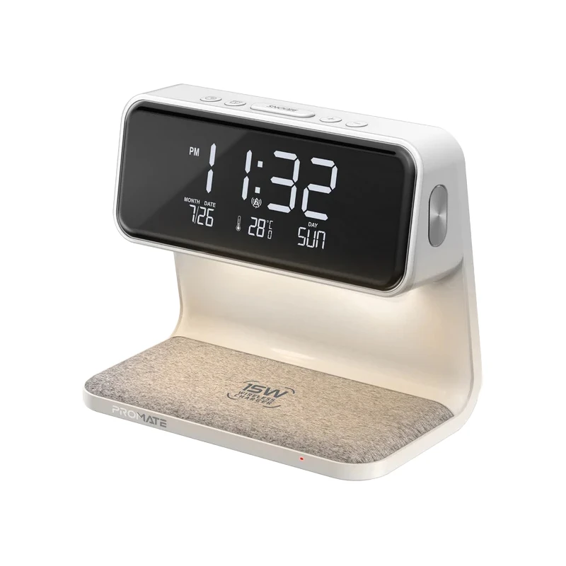 شارژر بیسیم پرومیت مدل LUMIX-15W.WHITE دارای نمایشگر ساعت این محصول ترکیبی از راحتی، ظرافت و نوآوری است: در این محصول یک شارژر بیسیم 15 وات و یک ساعت با نور شب LED تعبیه شده است. ساعت دیجیتال لومیکس-15 وات بسیار کاربردی و ساده است و میتواند ساعت 12 ساعته و 24 ساعته را به همراه زمان، تاریخ و دما نمایش دهد. نور شب لامپ LED در 3 حالت قابل تنظیم است که به شما امکان میدهد فضایی آرامش بخش در اتاق خواب ایجاد کنید. طراحی شیک، زیبا و ضد لغزش شارژ بیسیم، لومیکس-15 وات را به گزینهای جذاب و شیک برای فضای اتاق تبدیل میکند.
