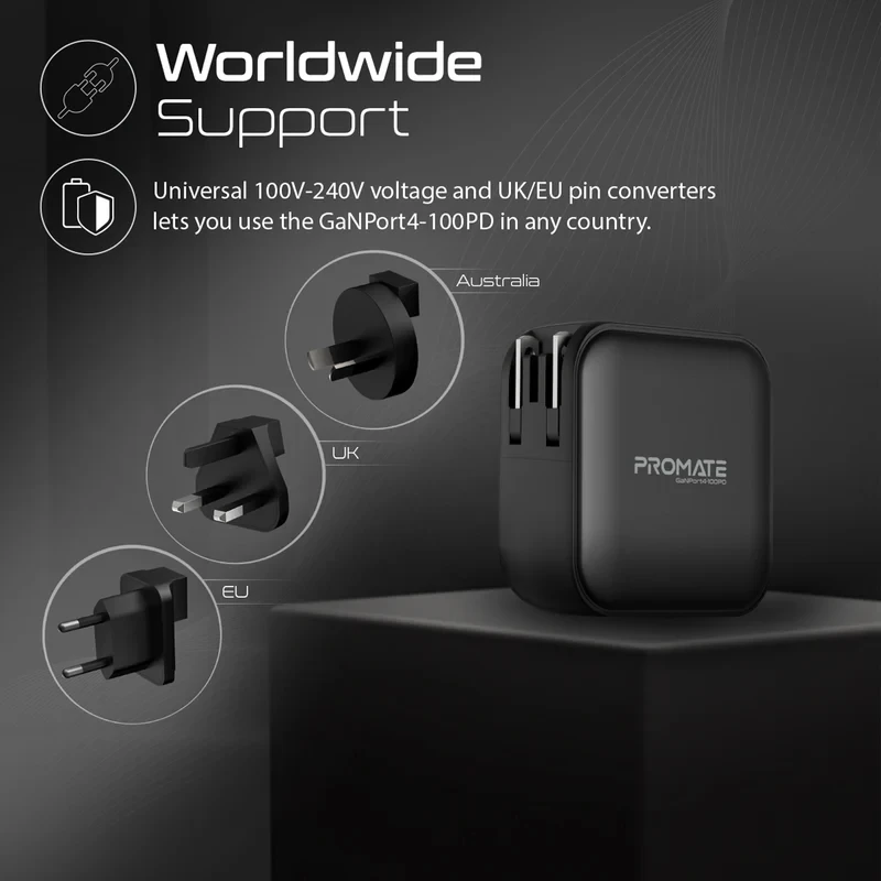 پشتیبانی جهانی: با ولتاژ 240-100 ولت و مبدل های پین EU/UK و AU، میتوانید از PD4-100GaNPort در هر نقطه از جهان استفاده